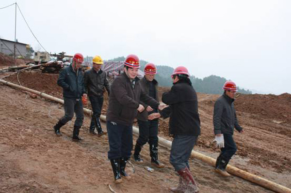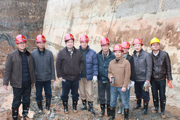 董事長、總經(jīng)理王元旦一行首先來到基坑澆筑、混凝土攪拌站等施工現(xiàn)場進(jìn)行察看,與施工人員一一握手,并聽取了春節(jié)期間帶領(lǐng)員工奮戰(zhàn)在施工一線的公司副總經(jīng)理聶玉和的生產(chǎn)情況匯報。董事長、總經(jīng)理王元旦詳細(xì)詢問了攪拌站的生產(chǎn)能力能否滿足施工要求,工程的進(jìn)展情況及后期施工中的各項措施,對項目部全體員工放棄節(jié)假日搶工期、保質(zhì)量、抓進(jìn)度的奉獻(xiàn)精神給充分肯定和高度評價,他勉勵大家保證質(zhì)量安全的前提下,抓緊時間完成大壩防滲面板的施工、再苦再累也要咬緊牙關(guān)挺過去,并要求施工項目部合理安排好大家春節(jié)期間的工作和生活。