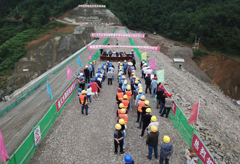 該工程是一座混凝土面板堆石壩,壩高47m,大壩填筑工程量42萬m3,大壩于2021年3月5日開始填筑,2021年6月30日填筑完成。大壩填筑完成后,得到了建設(shè)單位、監(jiān)理單位及總包單位的祝賀與肯定。該工程屬貴州省“鄉(xiāng)鄉(xiāng)有穩(wěn)定水源”項(xiàng)目,年供水量250.8萬m3,建成后可為安樂溪鄉(xiāng)集鎮(zhèn)及農(nóng)村20000余人提供安全穩(wěn)定供水和21670畝農(nóng)田灌溉用水以及將極大緩解當(dāng)?shù)厝彼桶踩嬎畣栴},意義重大。施工項(xiàng)目部將繼續(xù)堅(jiān)持“科學(xué)管理、精心組織”理念,嚴(yán)格按設(shè)計(jì)和規(guī)范要求,在確保安全和質(zhì)量的前提下加快施工進(jìn)度,為安樂溪人民盡早提供安全水、干凈水及改善供水目標(biāo),確保在合同工期以內(nèi)按時(shí)、按質(zhì)、按量盡早建成交付建設(shè)單位投入使用。集團(tuán)副總裁胡鴻煌參加大壩封頂儀式。