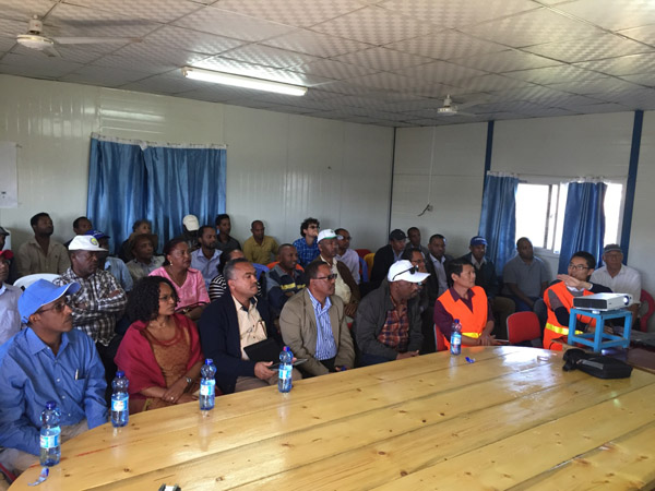 部長一行于上午10時許抵達后,在我項目部主營地召開了現場會議,埃塞公司副總經理兼項目經理黃生寶詳細的介紹了項目的進展情況及六大施工管理區的實施情況。并表示,盡管面臨著工期縮短、征地困難等諸多阻礙,我司一定會團結各方、迎難而上,完成施工任務為埃塞水利發展貢獻力量。