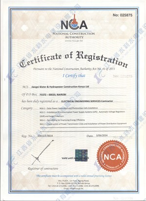 江西省水利水電建設有限公司肯尼亞分公司接到通告后,積極準備相關資料,憑借公司的技術實力和肯尼亞市場的良好業績,最終取得所有六項的一級證書。其中包括:水利施工一級,公路工程施工一級,房屋建筑工程施工一級,結構施工一級,電力工程施工一級和機電工程施工一級,有力地提升公司的品牌影響,提升了公司資信競爭力,為公司在肯尼亞各項工作的全面深入開展創造了積極有利的條件。