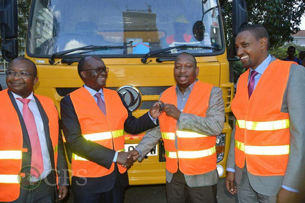 總督Mike Sonko及內(nèi)羅畢交通局部長(zhǎng)James Wainaina Macharia在清污車(chē)前合影(左2為部長(zhǎng)James,右2為總督Mike Sonka)