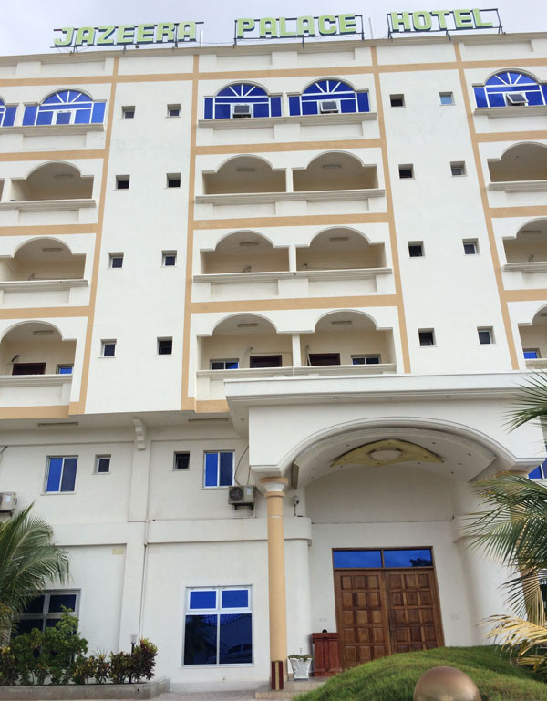 我們?nèi)胱〉氖前雿u皇宮酒店,也是中國駐索使館的臨時辦公產(chǎn)所。三道門的安全防護(hù)可謂警備森嚴(yán),戰(zhàn)爭國家的氣象從這可見一斑。酒店內(nèi)布置簡單,但設(shè)施齊全,與酒店外充滿殺氣的氣氛不同,酒店內(nèi)人來人往,商人喝著咖啡悠閑地談著生意。我們也坐著邊喝咖啡邊商談工作計劃,不時有索馬里人來打招呼,用中文說“你好”,并客氣地握手表示熱情歡迎來到摩加迪沙。