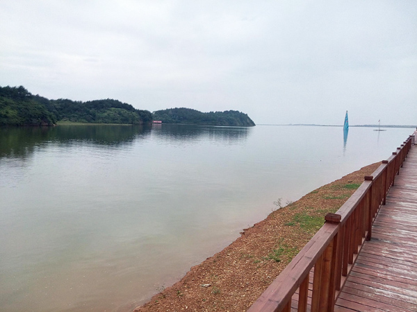 走過一段緩長的混凝土臺階,映入眼簾的是一片寬闊無垠的湖面,天青色的水面被微風揉出一段段波紋,宛如一匹極其細膩柔軟的綢緞。湖面點綴的,除了長滿了藏青色樹木小島外,還有一艘艘或藍白或紫紅涂裝的游艇,在碧波之上劃出一道道雪白的弧線。一艘紅柱黃瓦的游舫緩緩駛離臨時的游客碼頭,幾只野鴨伴隨著游舫歡快嬉戲。