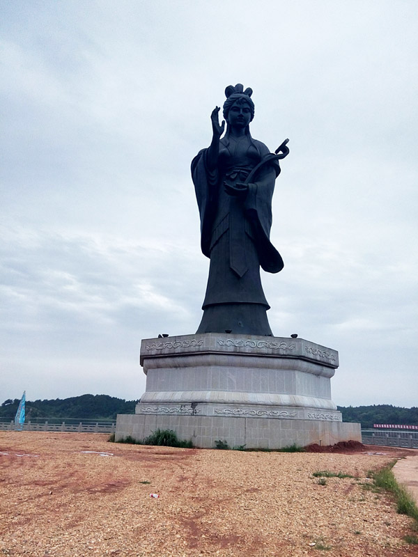 沿著岸邊的鵝卵石小道,我們一路前行至一座仿古的小橋前,橋面由木板鋪就,木板涂滿紅漆,煞是鮮艷惹人。對比之下,混凝土做成的橋梁則彰顯含蓄,而表面雕琢出類似年輪的紋理,使橋梁更顯內斂深沉,又不覺突兀。小橋兩側的欄桿由木條構成,上面卻是橙黃的漆面,雕有花草鳥石,十分精細。走過木橋,再行穿廊過巷,出現在眼前的便是一座近30米高的古代女子雕像,雕像呈深灰色,坐落于八棱型花崗巖底座上。女子鵝蛋臉型,梳著唐朝云髻,頭頂六瓣花飾,身著寬袖宮裝,右手豎起手印,左手平托一如意,背朝鄱陽湖,臉朝對面的斗笠山。走近細看,底座上有漢白玉板,上面書寫了女子姓名與生平,這是著名的“饒娥像”。