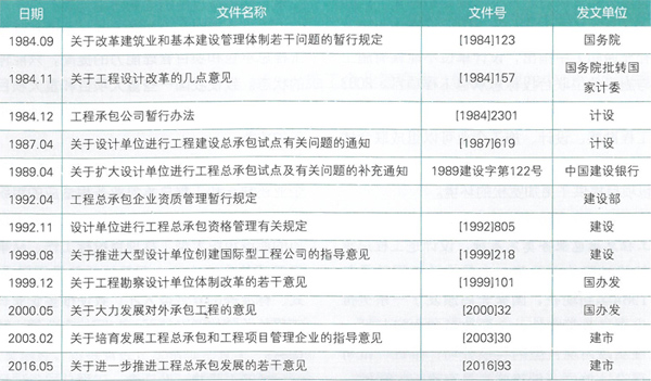 20世紀(jì)80年代,我國相關(guān)部門就下發(fā)文件,要求在設(shè)計、施工企業(yè)組建開展工程總承包的試點,從國家頒布的一系列文件中可以看出我國在推廣工程總承包業(yè)務(wù)方面的幾點變化(見表2 )。